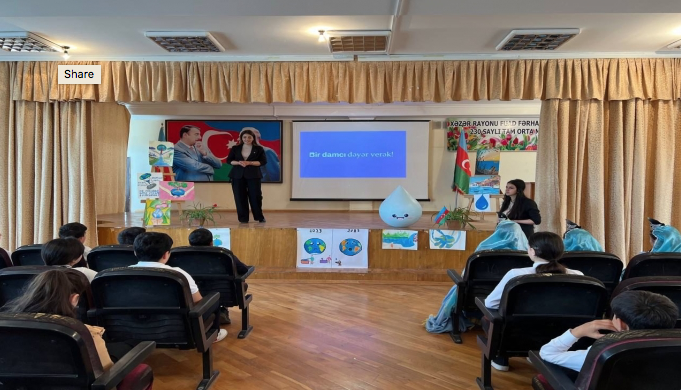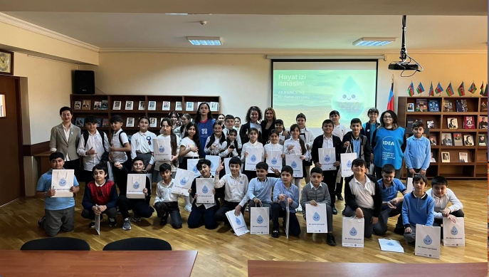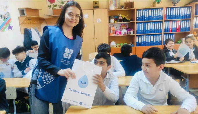 8-12 may tarixlərində layihə təşkilatçıları Bakı şəhəri 46 və 138 nömrəli tam orta məktəblərə səfər edərək 5-7-ci sinif şagirdləri ilə görüşlər keçirib, sudan qənaətlə istifadənin vacibliyi barədə təqdimatlarla çıxış edib, onlara sudan düzgün istifadənin əhəmiyyəti barədə biliklər toplusu olan “Bir damcı” kitabı və müxtəlif hədiyyələr təqdim ediblər.