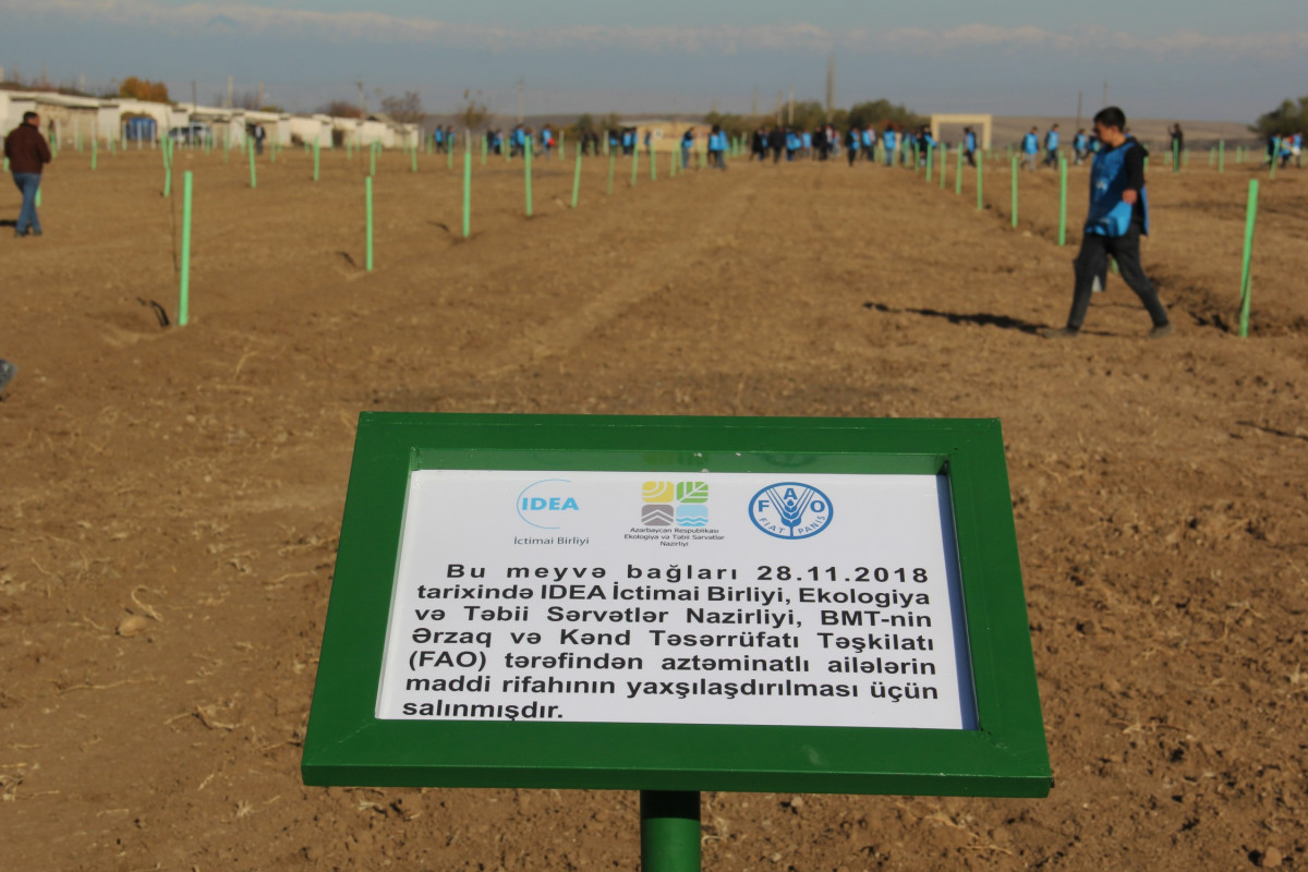 IDEA İctimai Birliyi, Ekologiya və Təbii Sərvətlər Nazirliyi və BMT-nin Ərzaq və Kənd Təsərrüfatı Təşkilatının (FAO) birgə təşəbbüsü ilə noyabrın 28-də Göygöl rayonunda aztəminatlı ailələr üçün meyvə bağları salınıb.