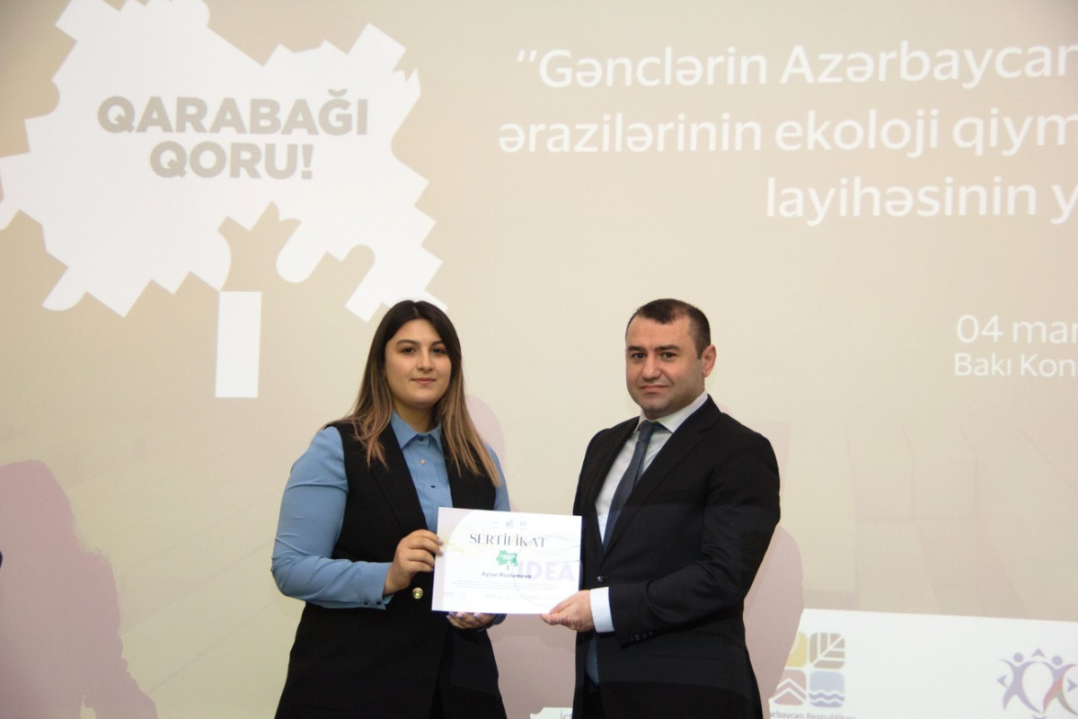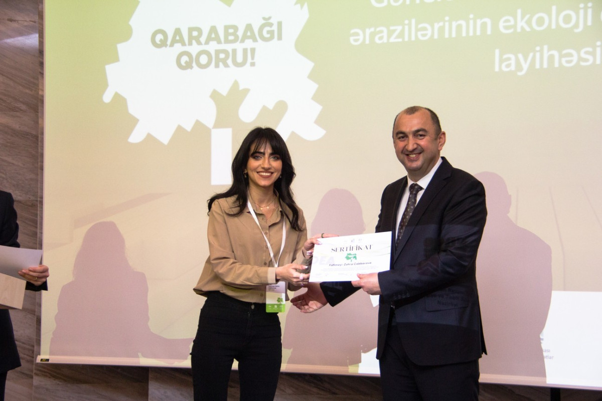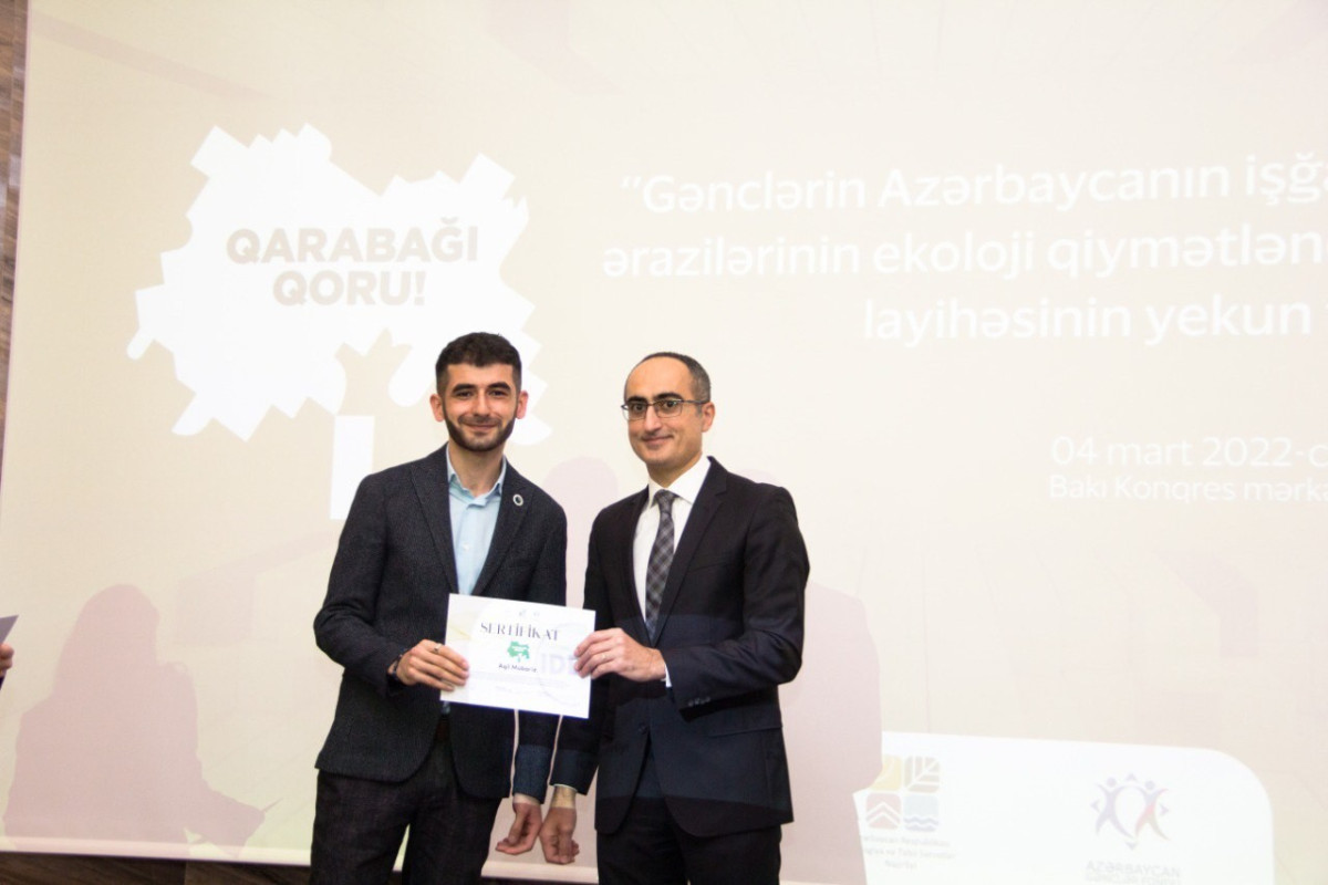 Daha sonra gənclərə uğurla həyata keçirilən layihədə iştirak üçün sertifikatlar, eləcə də Qarabağın ekoloji qiymətləndirilməsi prosesinə töhfələrinə görə təşəkkürnamə və xatirə hədiyyələri təqdim edilib.