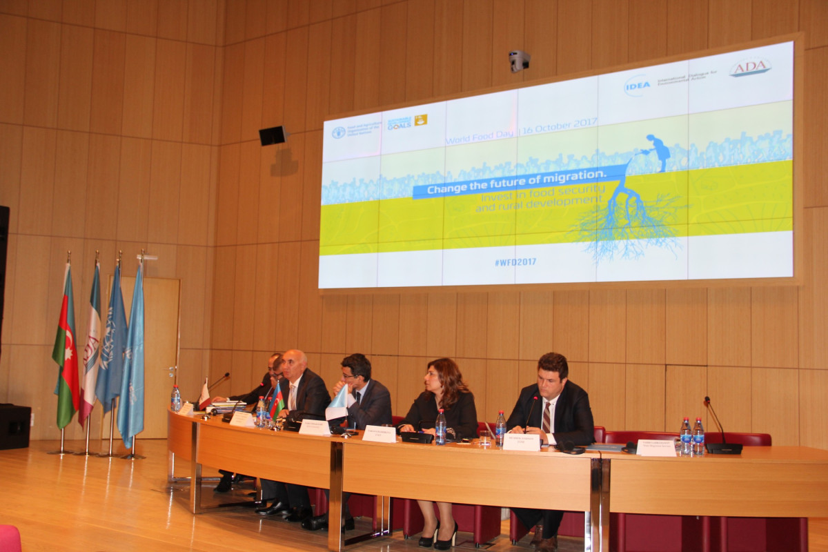 Oktyabrın 16-da ADA Universitetində IDEA İctimai Birliyi, Kənd Təsərrüfatı Nazirliyi və BMT-nin Ərzaq və Kənd Təsərrüfatı Təşkilatı – FAO-nun birgə təşkilatçılığı ilə Ümumdünya Ərzaq Gününə həsr olunan tədbir keçirilib. Ümumdünya Ərzaq Günü 2017 “Miqrasiyanın gələcəyini dəyişək: Ərzaq təhlükəsizliyinə və kənd yerlərinin inkişafına sərmayə qoyaq” şüarı altında təşkil olunub.