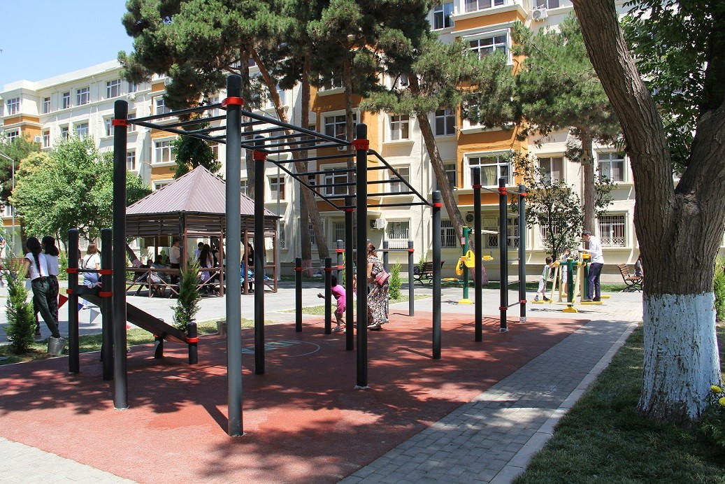 In the next courtyard improved within the framework of the project, the movement of persons with disabilities and those with limited mobility was taken into account, and in order to create favorable conditions for the development of children of all age groups and to ensure efficient leisure time for young people, 1 mini football pitch, a chess area, 4 sports facilities, a playground for children, and 16 benches were installed in the area. The main purpose of creating such areas is to help young people maintain a healthy lifestyle, strengthen their health, spend their free time effectively, and develop a habit of engaging in regular sports activities.